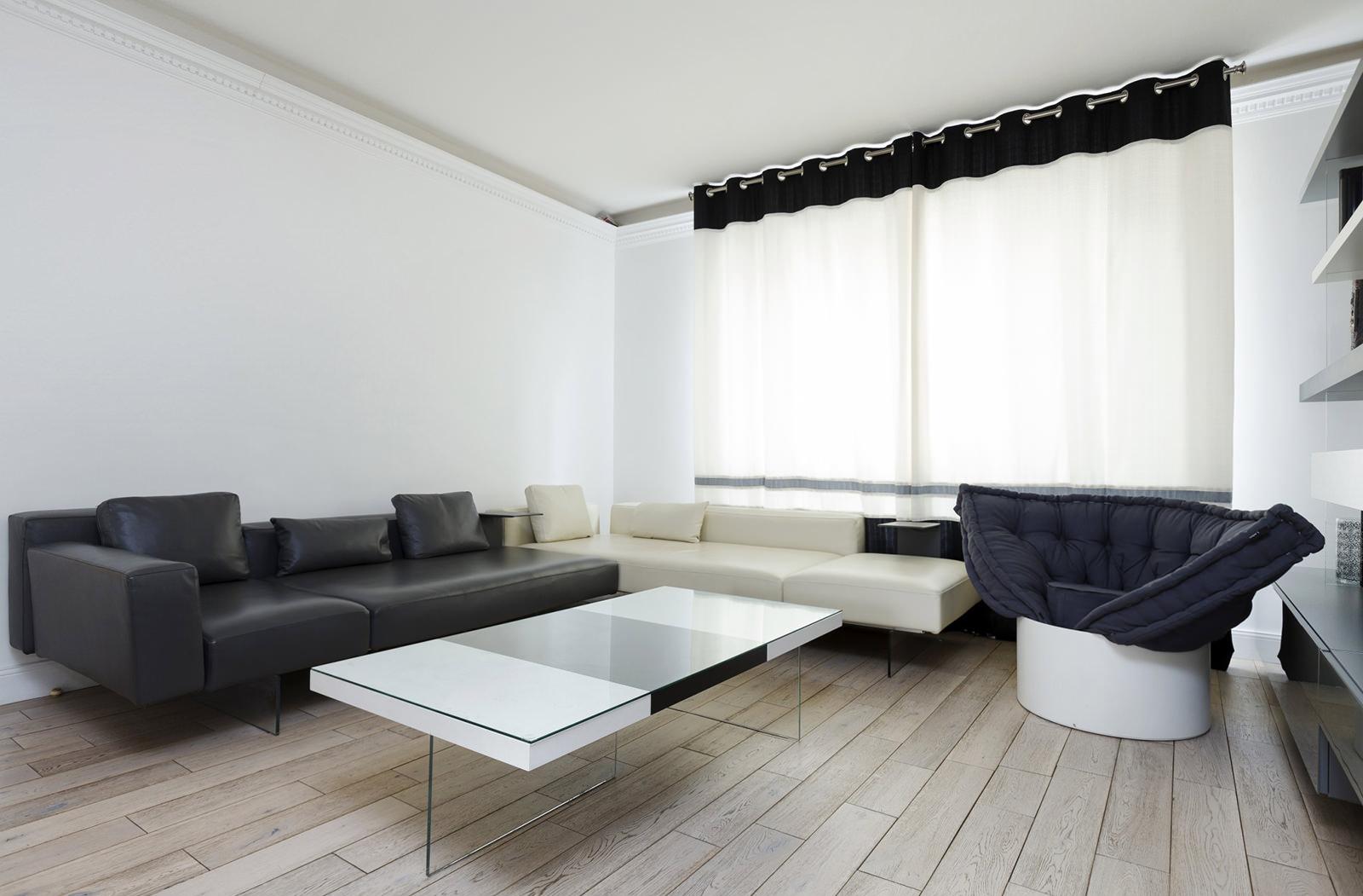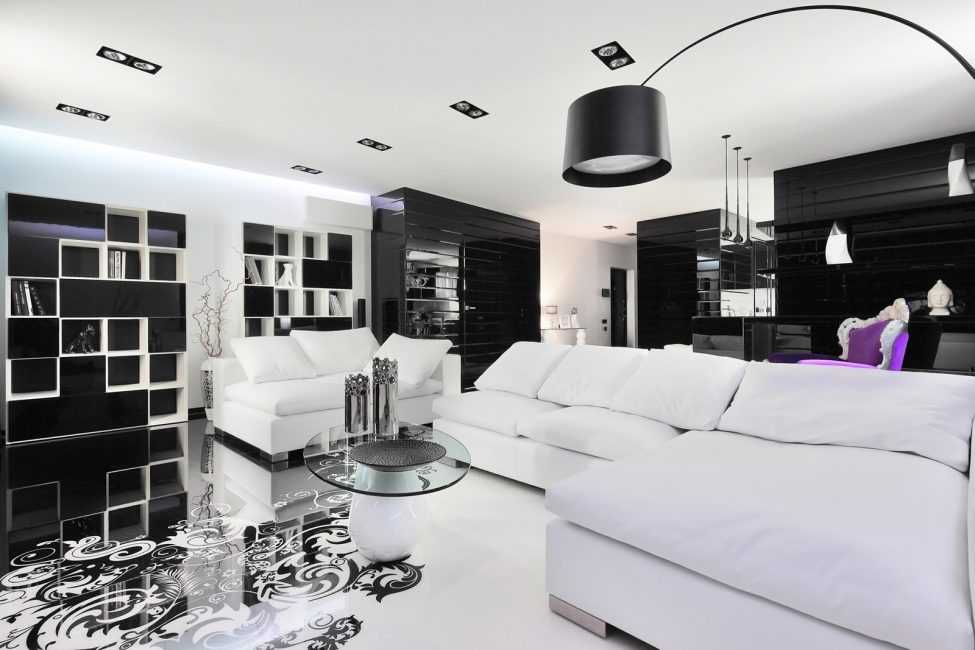 Не забывайте, что в черно-белом декоре для гостиной пол играет важную роль.
