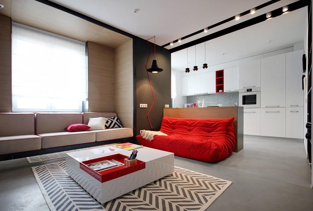 В-третьих, не используйте много яркой мебели – более оптимальным вариантом будут предметы светлых или нейтральных оттенков. Для того чтобы освежить гостиную, допускается применение только одного-двух мелких предметов: красный столик, желтый светильник, синий пуфик.