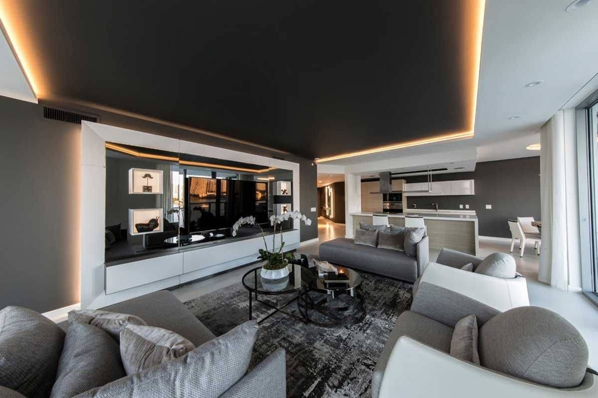 Зонирование потолка. Чёрный участок на белом потолке подчеркнёт ту или иную зону или поможет обозначить координационный центр. На примере представлен интерьер комнаты с чёрно-белым потолком. В данном случае центральная часть двухуровневого потолка, выделенная цветом, подчёркивает зону гостиной в большой комнате неправильной формы.