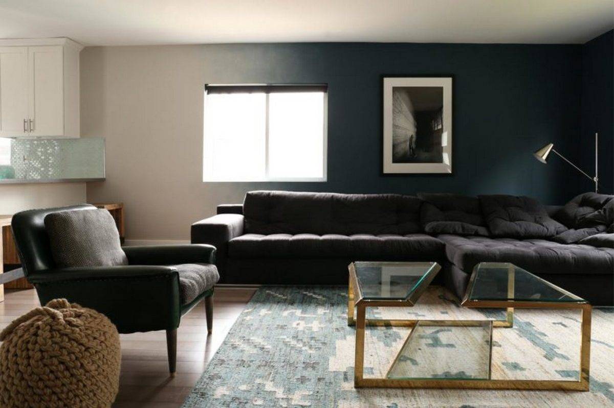 Для того чтобы ярко выделить свою позицию и полностью поменять представление о собственной гостиной достаточно просто сделать акцентную стену в чёрном цвете.