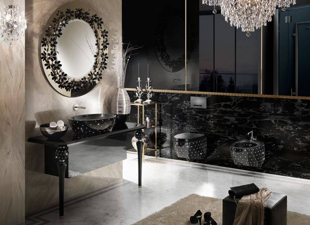 Если вам нравится дизайн ванных комнат в гламурном стиле или с элементами ретро, остановите свой выбор на черном корпусе для ванны. Люстры с многочисленными украшениями также отлично подходят для высоких ванных комнат. Однако с количеством украшений не стоит перебарщивать, чтобы не перегружать интерьер, особенно если это небольшая ванная комната.