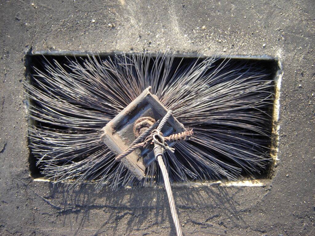 Для нижней прочистки щётки прикрепляют к гибким или сборным палкам. Вводят их в дымоход через специальные отдушины. При чистке дымохода приспособления должны поступательно двигаться вверх-вниз. Круговые движения приводят к разбалансировке и раскрутки чистящего инструмента. Работы проводят в сухую, безветренную погоду.