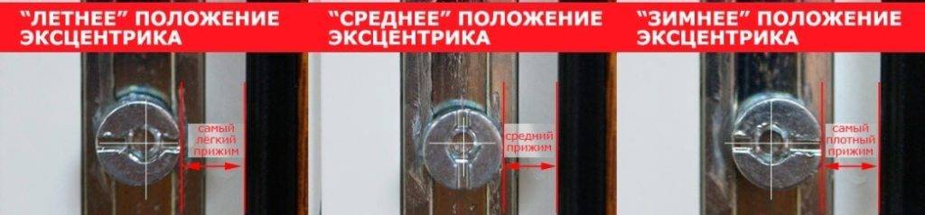 Эксцентрики могут занимать три возможных положения. Слабый прижим используется летом, поскольку обеспечивает небольшой зазор между створкой и рамой. Стандартный режим хорош при умеренных холодах, при сильных морозах он не обеспечивает достаточной герметичности. С приходом зимы следует обеспечить плотный контакт рамы и створки, для чего выполнить регулировку эксцентриков, установив их в положение «сильный прижим».