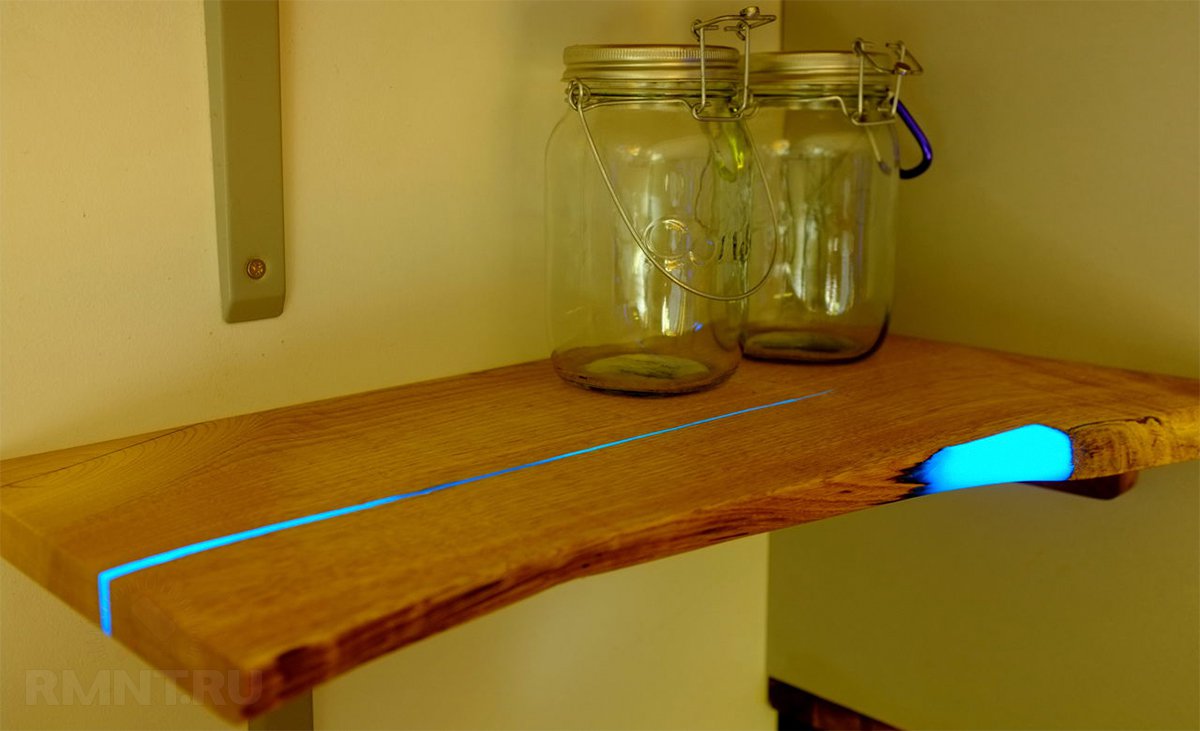 Особенно насыщенно светятся в темноте поверхности из стекла, которые обработаны люминесцентным колером. Такой подход используется при изготовлении витрин. Также можно окрашивать небольшие стеклянные изделия, такие, как столешница, полка шкафа, абажур или ваза.