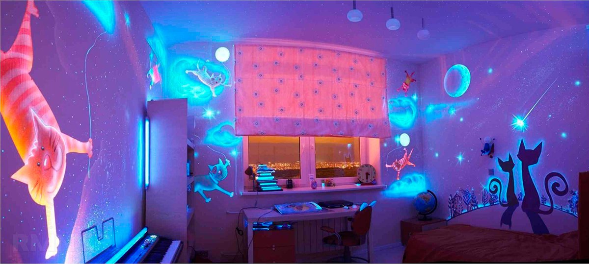 Используют подобные светящиеся вещества и при оформлении интерьеров частных домов и квартир. Отделка стен и многоуровневых потолков с помощью материалов на основе флуоресцентов обходится недёшево, но при наступлении ночи комната просто преображается, приятное свечение придаёт интерьеру красоту и загадочность.