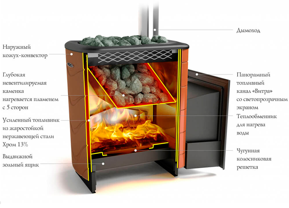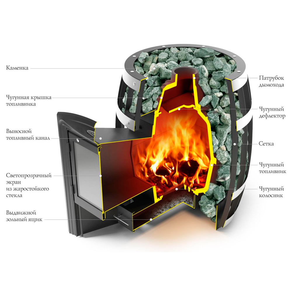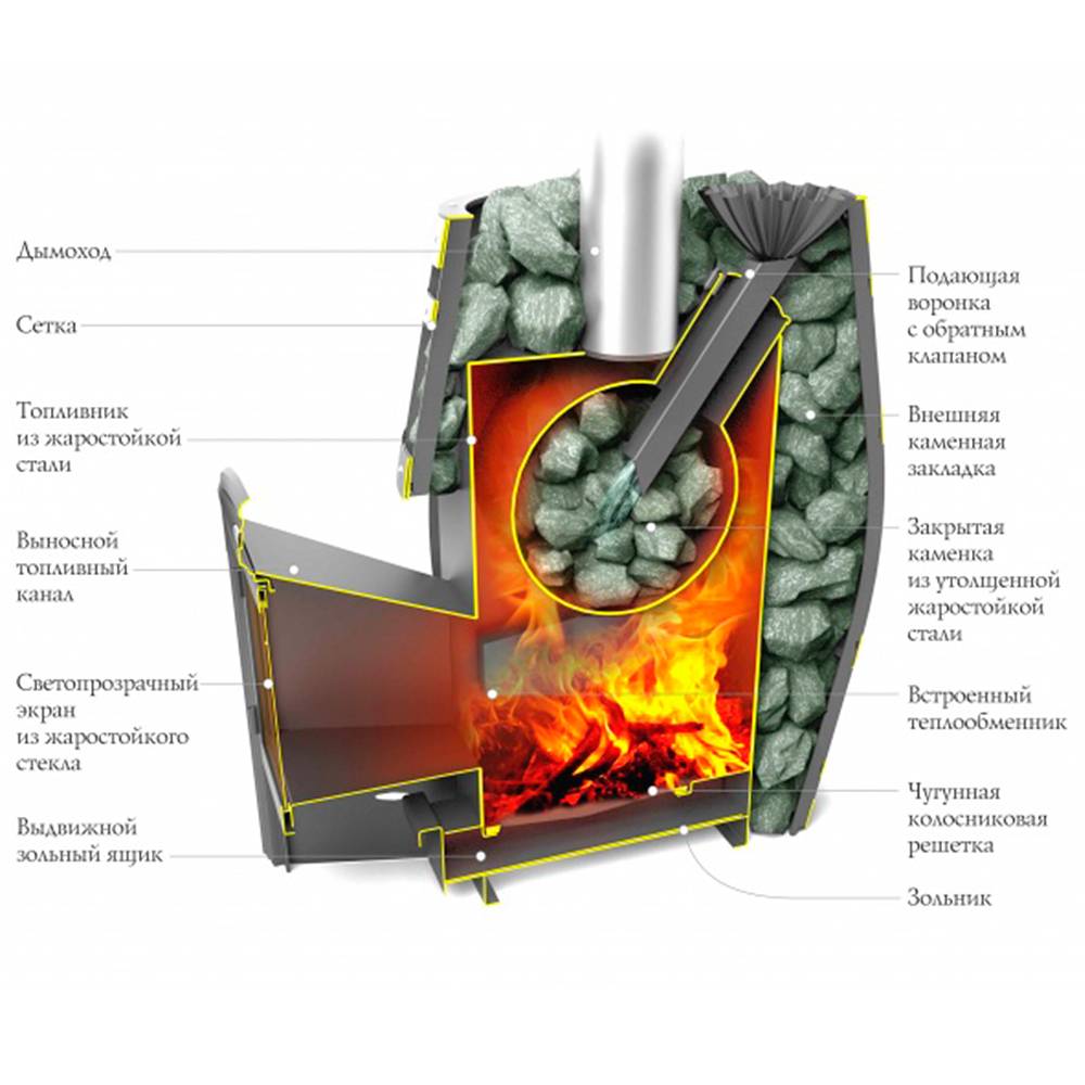 Модель, способная произвести прогрев помещения очень быстро, благодаря возможности конвекции через сетку по диаметру каменки. Теплообменник в данном агрегате располагается непосредственно внутри топки, и его нагрев происходит от открытого пламени.