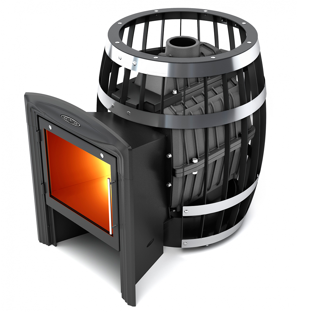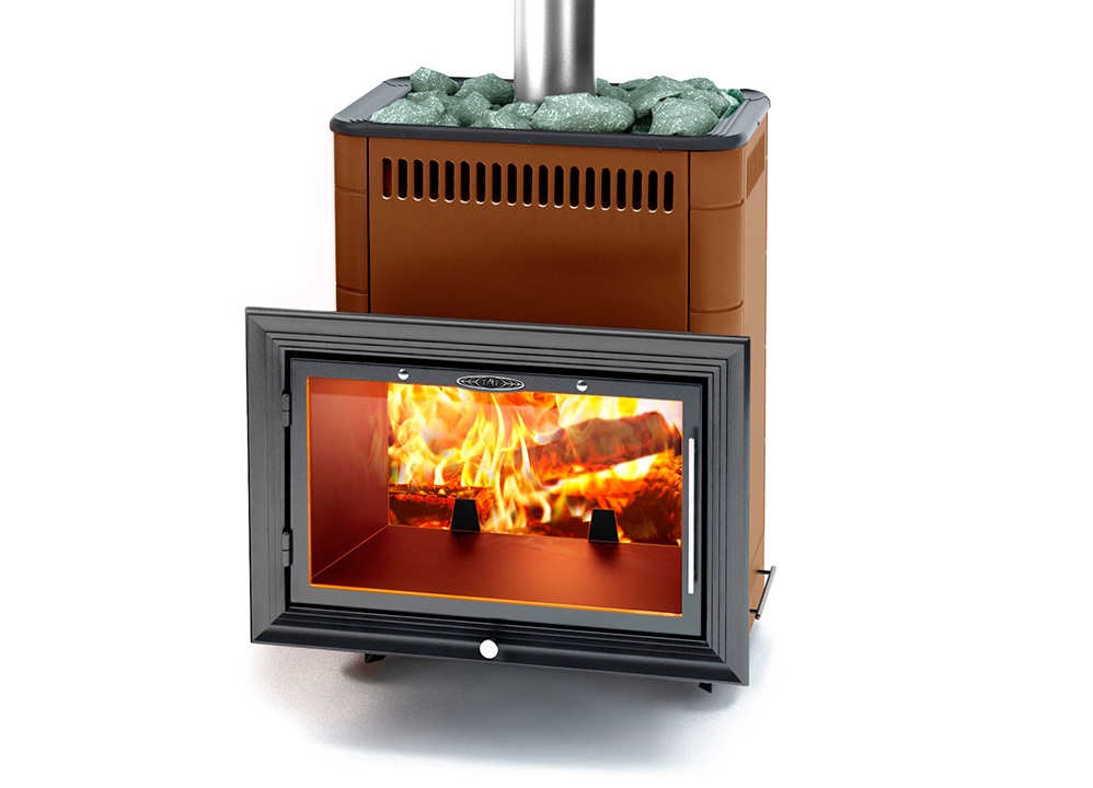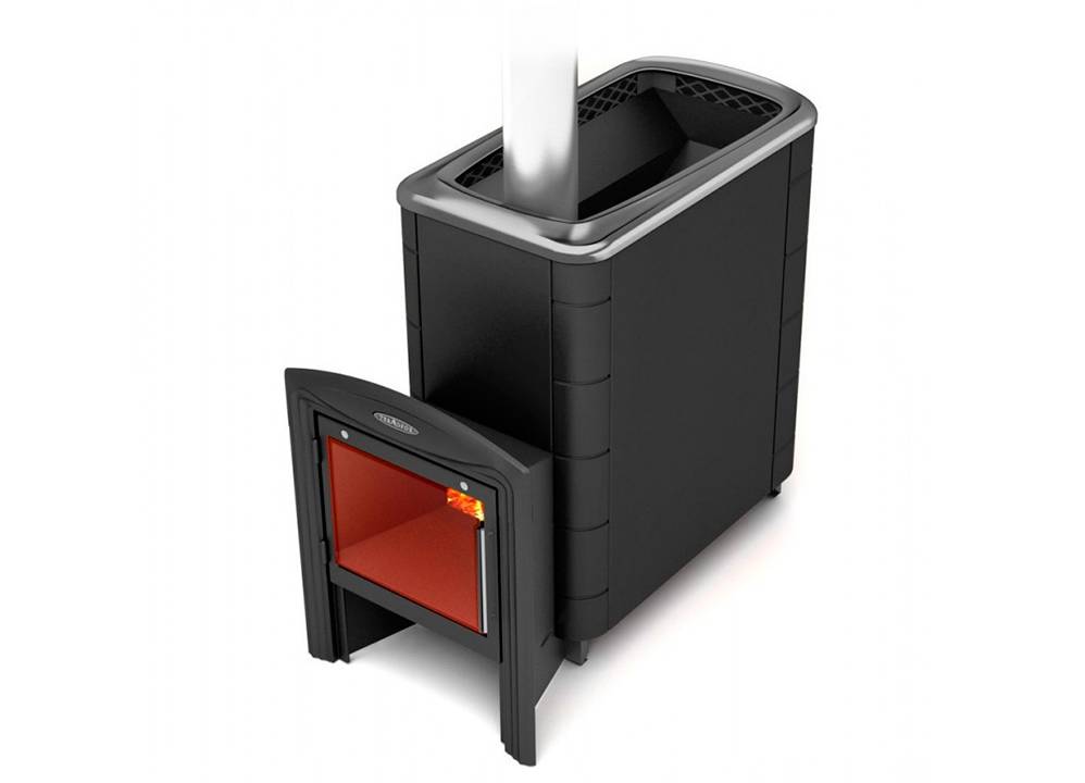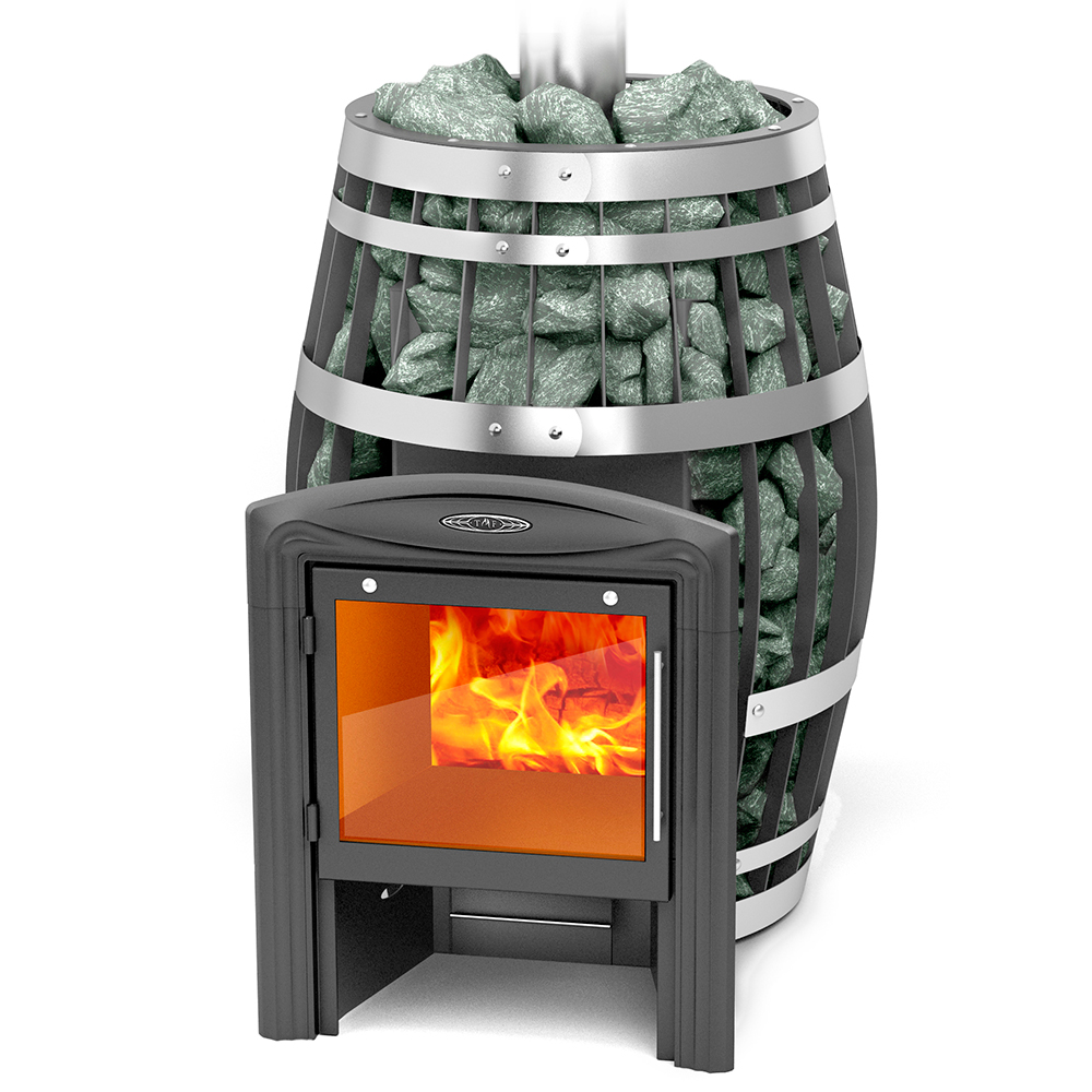 Модель с закрытой каменкой, оснащенной воронкой с обратным клапаном-дозатором. Скорость нагрева увеличена благодаря излучению огня. Каменка вмещает до 225 кг камней, которые хорошо сохраняют тепло в парной. Топка экранируется закладкой из камня, что позволяет сохранять стабильную температуру дольше. Дверца печи оснащена стеклом.