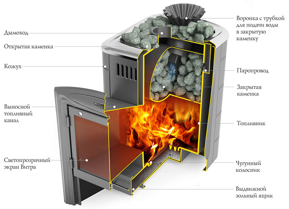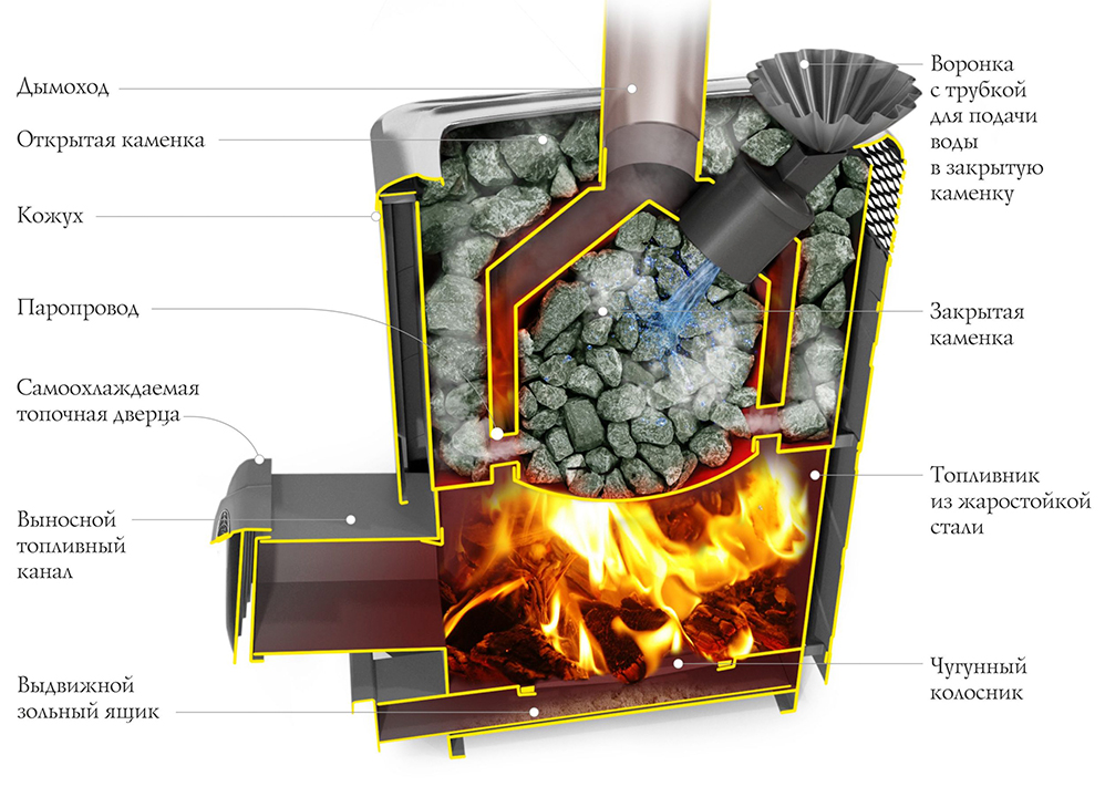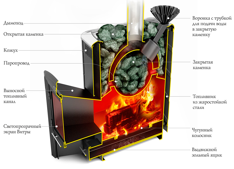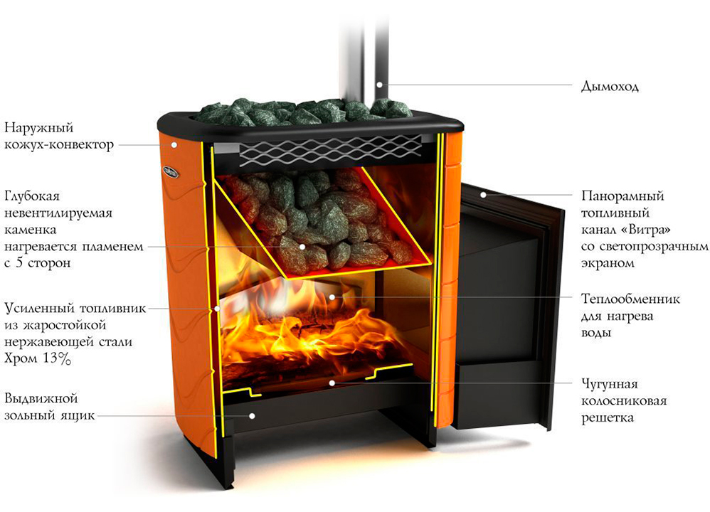 Режим парения может варьироваться от финской сауны до русской бани. Зольник в форме совка и позволяет производить очистку печи даже во время топки.