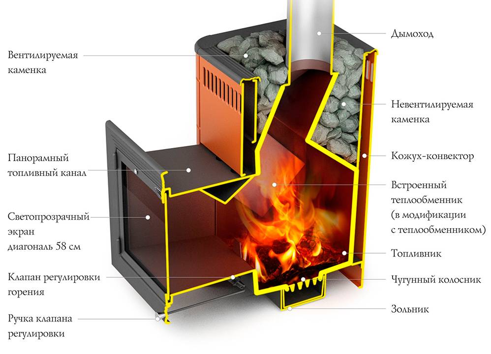 Каменка у модели двухсекционная — с вентиляцией и без. Оснащена теплообменником, расположенным непосредственно в топке. Это позволяет быстро нагреть парилку и надолго сохранить тепло.