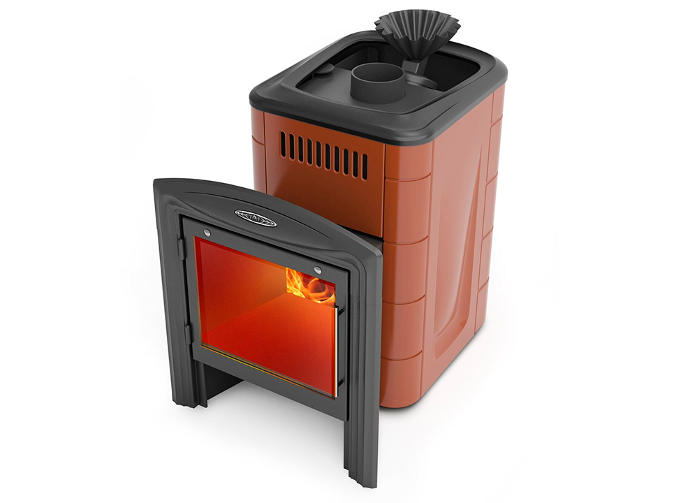 Модель для небольших по объему, до 12 куб./м, помещений. Производится из хромированной стали и оформлена дверцей цвета терракота. Каменка 2 типов: закрытого типа выдает качественный, мелкий пар, способствующий легкому дыханию; открытая позволяет быстро прогреть сухой воздух.