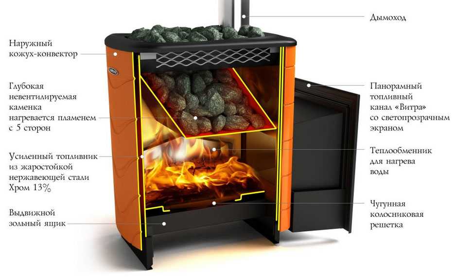 Каменка у модели двухсекционная — с вентиляцией и без. Оснащена теплообменником, расположенным непосредственно в топке. Это позволяет быстро нагреть парилку и надолго сохранить тепло.