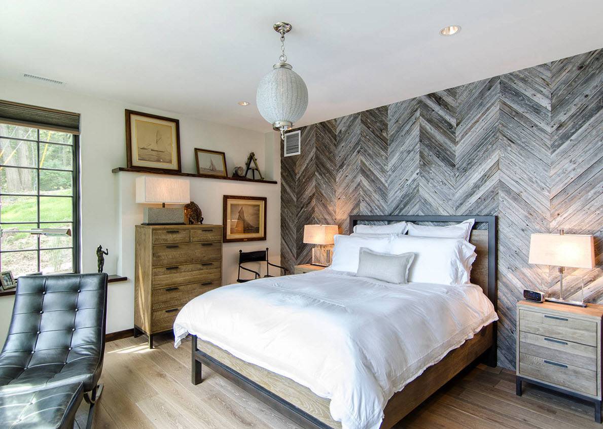 Оригинальным способом оформления спальни станет использование деревянных настенных панелей для облицовки поверхности за изголовьем кровати. В спальном помещении нам хочется теплоты и уюта, комфортной обстановки, которая бы способствовала благоприятной подготовке ко сну и радостному пробуждению каждый день. Именно такой настрой сможет дать современному интерьеру натуральность природного отделочного материала. Акцентная стена, оформленная с помощью ореховых панелей сама по себе эффектна, а вместе с настенным декором буде выглядеть как настоящий координационный и смысловой центр помещения для сна и отдыха.