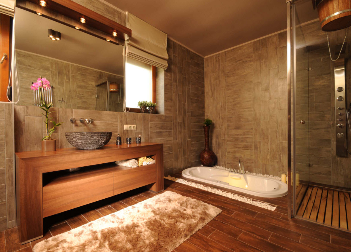 Ванная комната в шоколадно-медовых тонах – пристанище релакса и умиротворения. Приятные взору природные оттенки успокоят и снимут стресс, очистят мысли, пока вы будете очищать тело. Различные оттенки коричневого цвета не только в меблировке, но и отделке помещения, способны создать совершенно уникальную атмосферу.