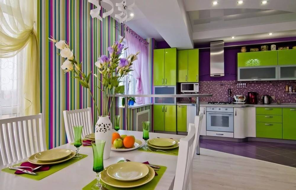 Равномерное распределение бежевого и фиолетового. Например, оформление стен светлыми бежевыми тонами + фиолетовая мебель (обеденные стулья, столешница и кухонный гарнитур или темные баклажановые шторы). Или, фиолетовые стены с обилием бежевого декора, светлой мебелью.