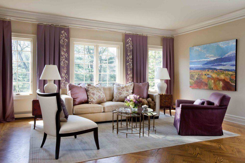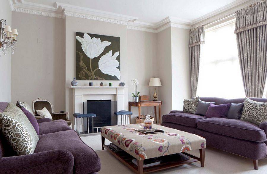 Акценты на фиолетовых деталях: абажуры, принты на мебели, ковры, вазы, отдельные тумбочки или столики и т.д.
