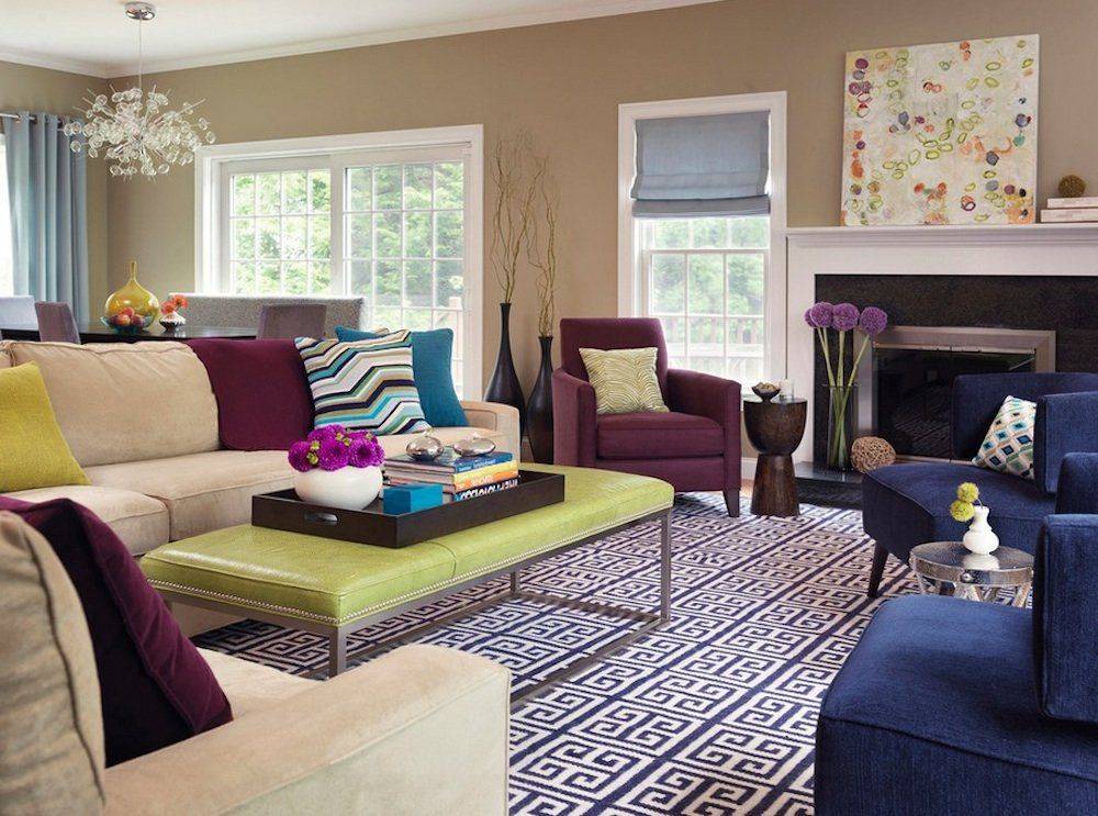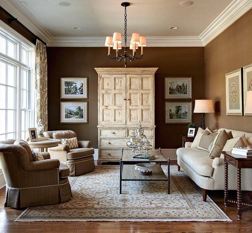Или, для коричневых и его производных (охра, спектр оранжевого,) контрастирующие краски – синие и фиолетовые и их производные. Например: стены и полцвета какао, бежевый гарнитур, бежевый стол, плюс голубой текстиль и голубые кресла.