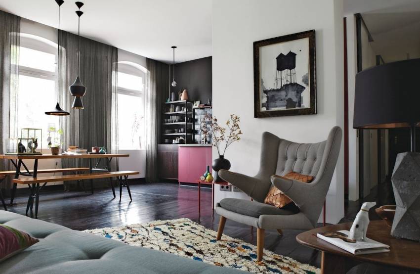 - бетонный пол (серый) + белая штукатурка (стены) + уютные мягкая мебель и текстиль ярких цветов;