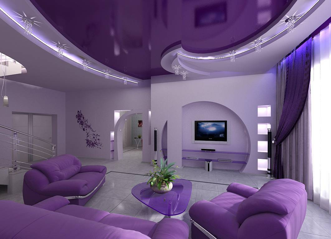 Оформить в фиолетовых тонах можно комнату подростка, но все равно следует использовать этот цвет осторожно в виде вставок или узоров на потолочной поверхности