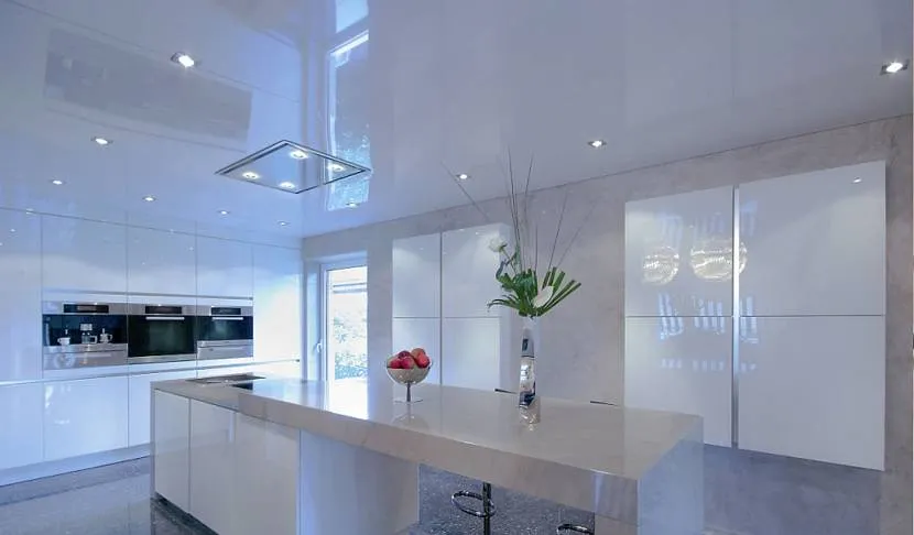 Зачастую, в многоэтажных домах, кухни отличаются небольшой площадью. По этой причине, наилучшее решение – потолочная поверхность с глянцевой фактурой. Сделав такой выбор, вы сможете хотя бы визуально увеличить пространство в помещении. Матовая фактура подойдет для больших кухонь в крупногабаритных квартирах или частных домах.