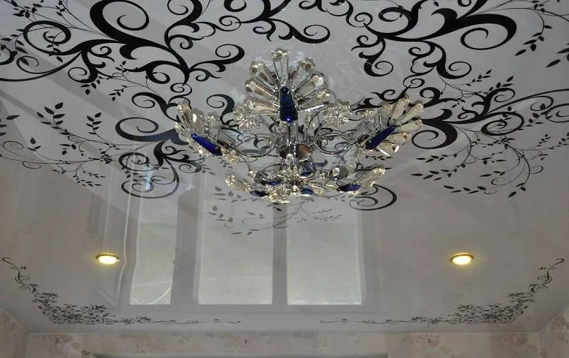 Добавьте узоров на потолок. Вы можете охватить всю плоскость изящными цветами, завитушками, украсить орнаментом. Как это выглядит — посмотрите у нас в каталоге. Вы будете поражены, но это все — натяжные конструкции!