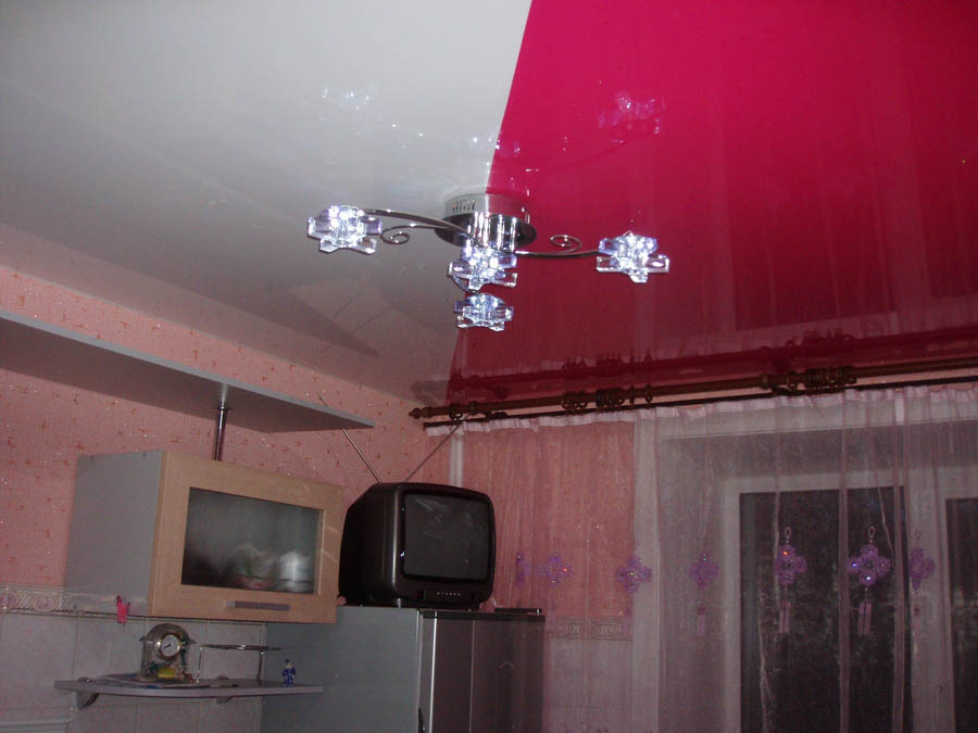 Особенности выбора цветных потолков для каждой комнаты будут разными. На кухне используйте ткани теплых, ярких цветов — они улучшают аппетит и повышают настроение. Хорошо работают такие цвета, как красный, желтый и оранжевый, а также их вариации. Если весь декор кухни выполнен в пастельных тонах, то такие же оттенки можно выбрать и для потолка помещения.