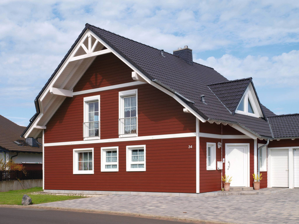 - Кровля красного цвета. Она универсальна, с ней можно комбинировать разные оттенки. Исключением являются салатовый и бирюзовый сайдинг.
