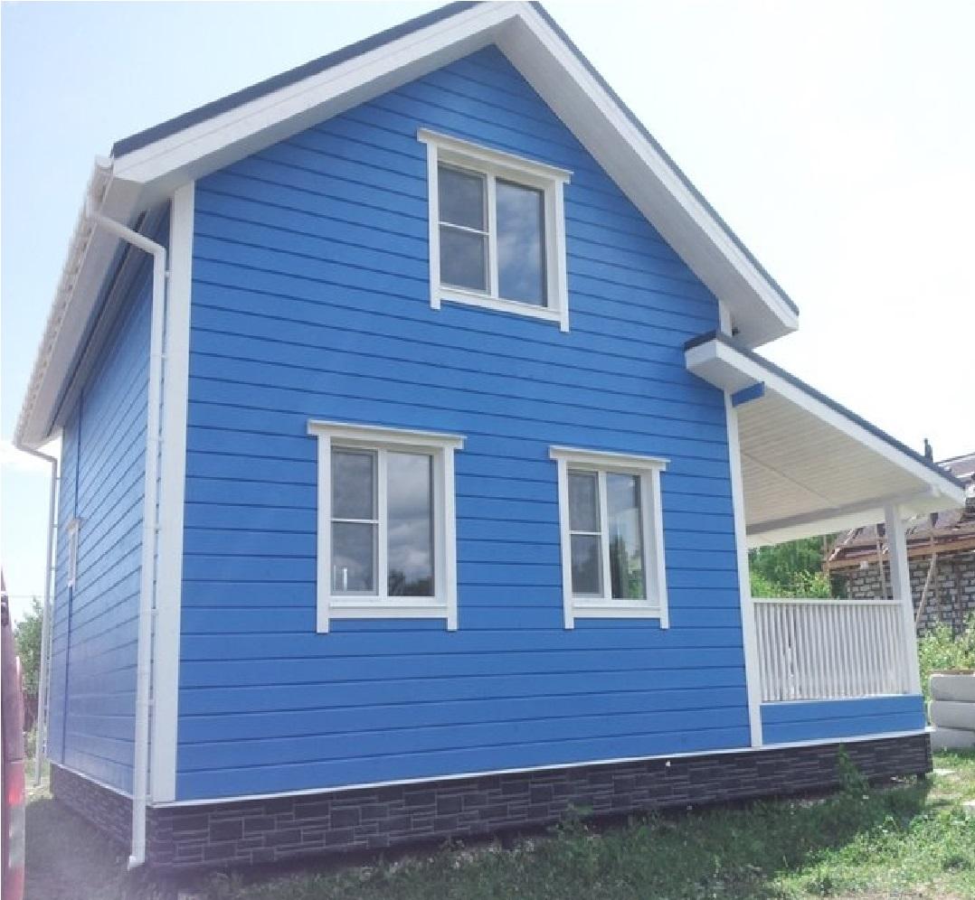 - Кровля синего цвета. В таком случае выбирается белый сайдинг, желтый или бежевый оттенок. Как вариант похожие цвета, такие как голубой или серый. Смелые используют и розовый сайдинг.