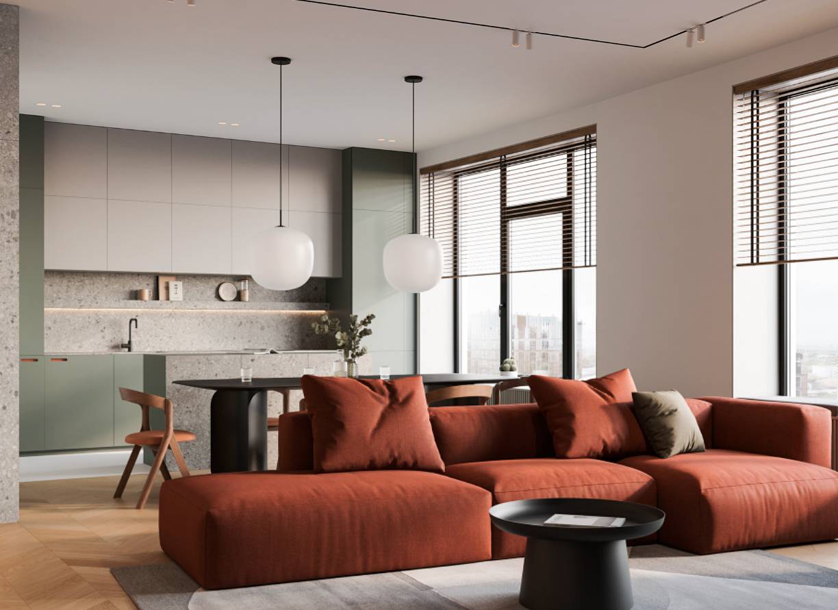 Интерьер кухни-гостиной в сочетании теплых оттенков. Автор проекта: Leonid Sizikov. Нажмите на изображение чтобы посмотреть весь проект!