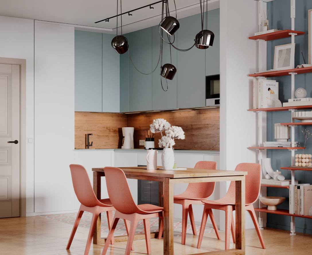 Интерьер кухни в сочетании теплых оттенков и небесно-голубого. Автор проекта: Katerina Maksimova. Нажмите на изображение чтобы посмотреть весь проект!