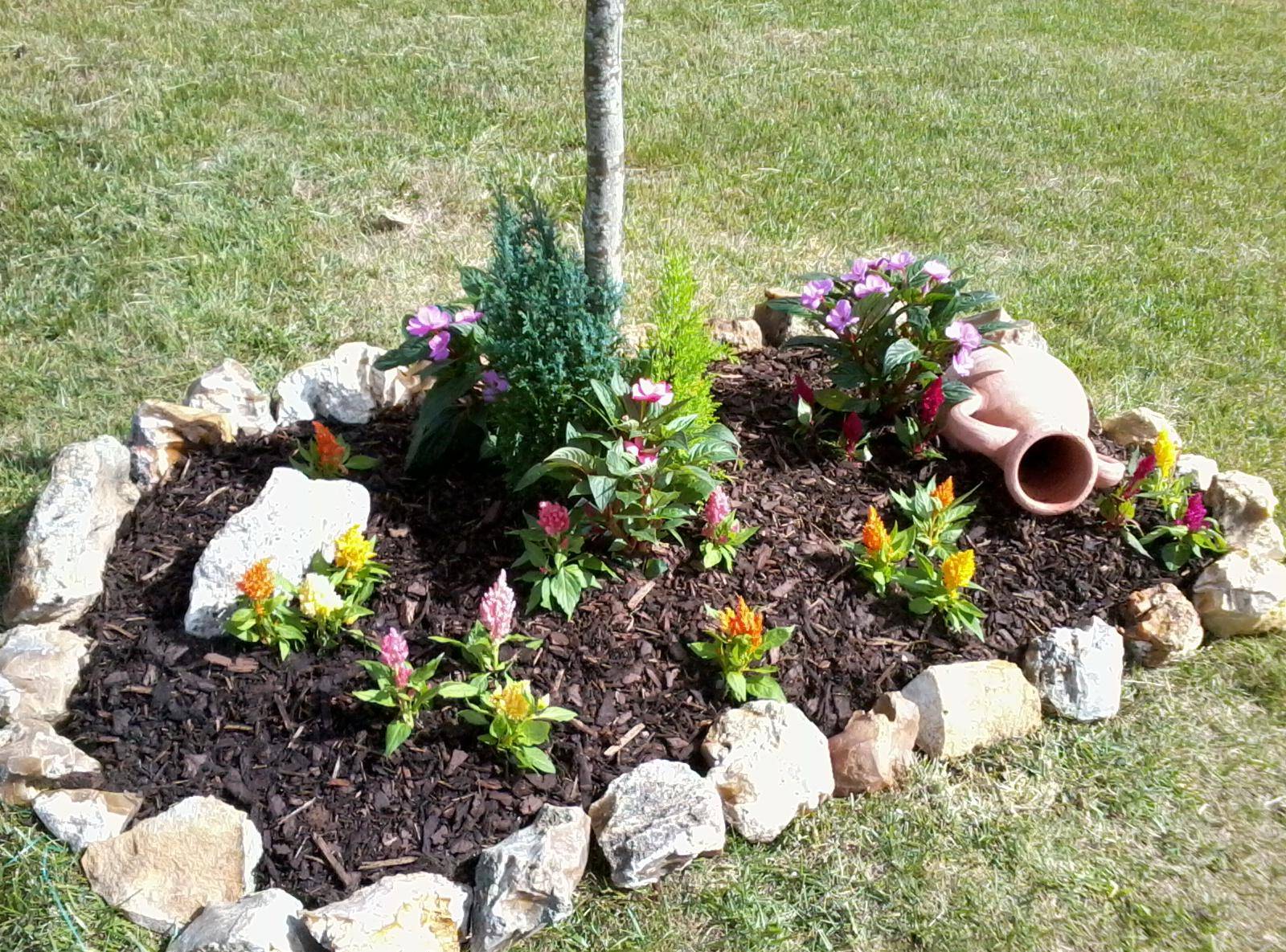 На этих фото показано оформление в саду цветников, состоящих из разных растений: