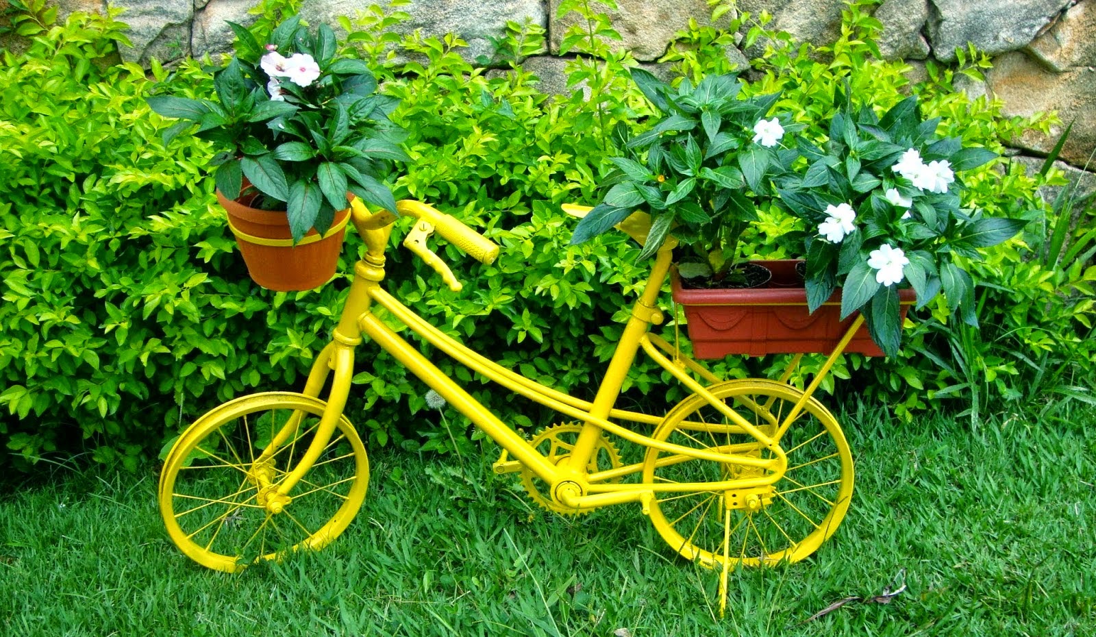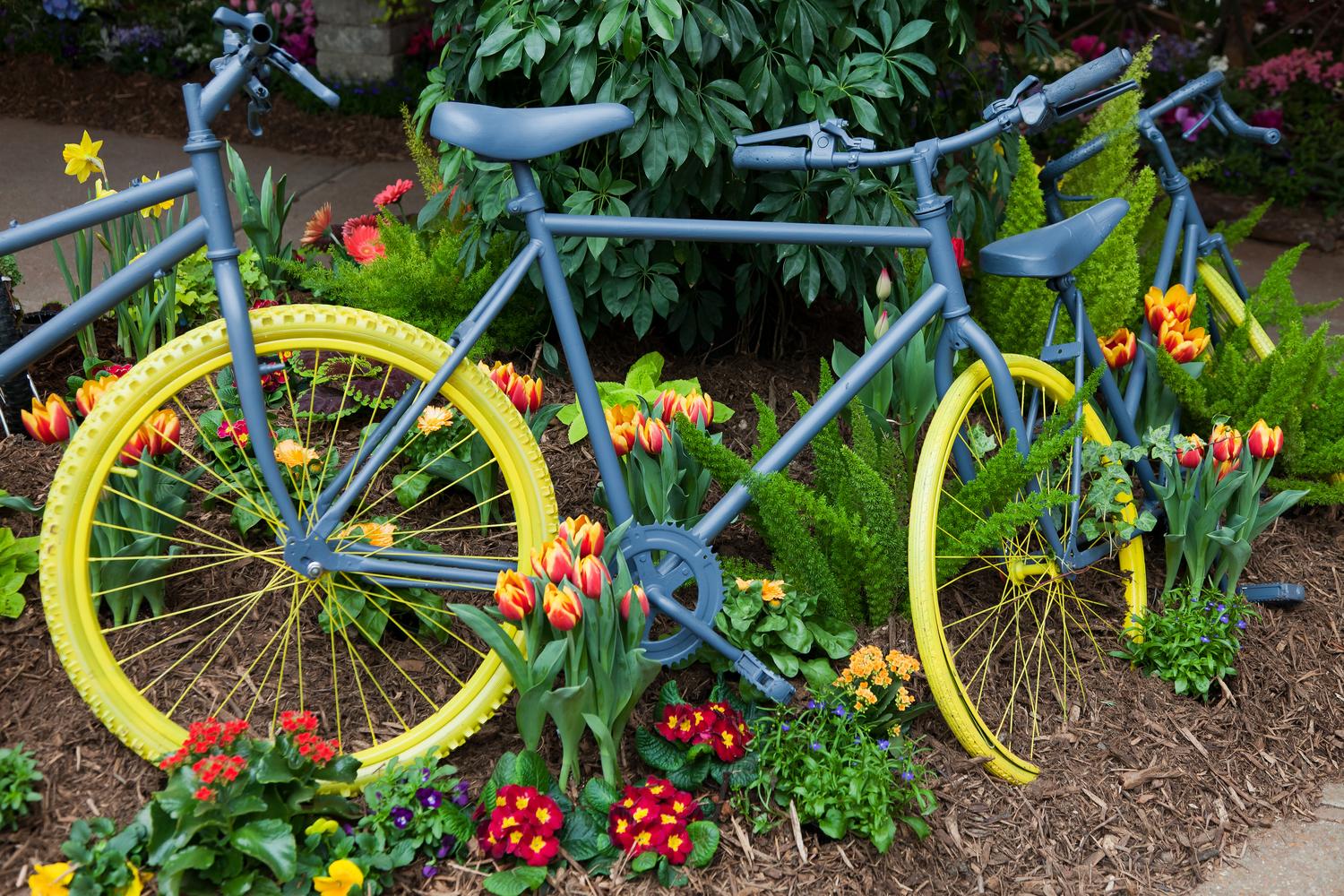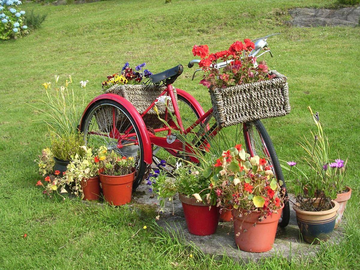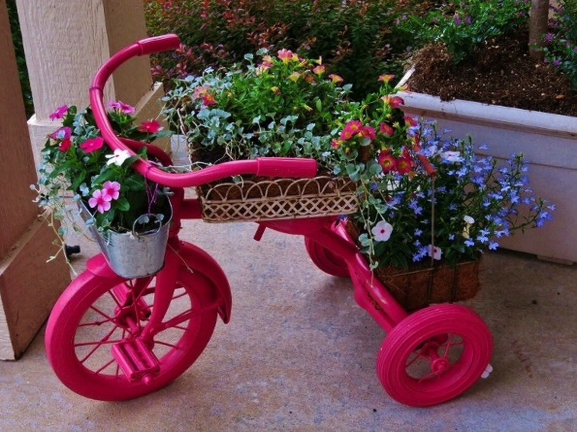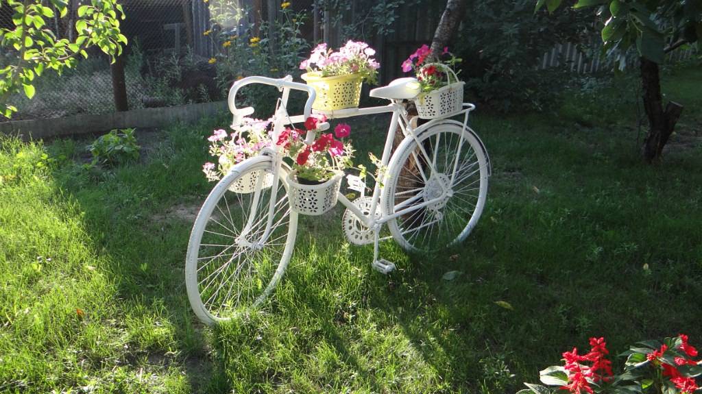 Вышедший из строя или неиспользуемый детский, взрослый велосипед можно трансформировать в необычную клумбу. Его ставят в сад, а на сидении и багажнике закрепляют горшки с цветами. Раму и остальные части лучше покрасить, чтобы изделие смотрелось свежее.
