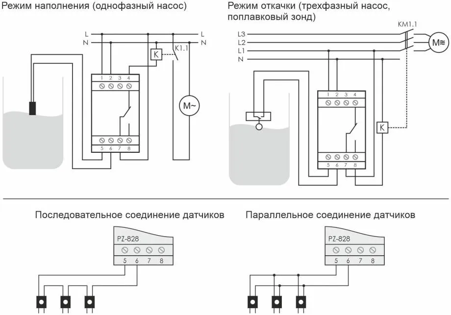 Обычно датчики уровня воды для управления насосом устанавливаются в нижней и верхней точке относительно наполненности резервуара либо в допустимой верхней в случае с подвалом. Третий сенсор отвечает за прием сигналов от первых двух и за передачу информации к насосному оборудованию. Так как создаваемые импульсы слишком малы для запуска и отключения сравнительно более мощной цепи, воспринимаются коммутируемые токи магнитным пускателем.