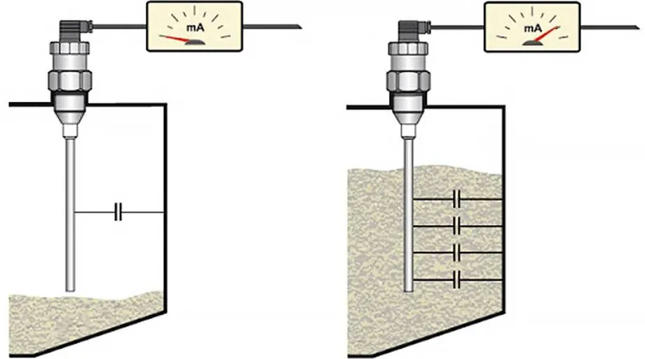 - Емкостный. С использованием таких уровнемеров можно точно идентифицировать предельное наполнение резервуара. Они подходят как для жидкостей, так и для сыпучих субстанций. Емкостные уровнемеры функционируют по такому же принципу, что и конденсаторы: измерение выполняется между пластинками чувствительного элемента. При достижении пикового значения на контроллер отсылается соответствующий сигнал. Иногда емкостные сигнализаторы работают по принципу «сухого контакта», при котором устройство срабатывает через стенку резервуара. Эти приспособления могут эффективно работать в очень обширном диапазоне температур, на их функционирование не влияет электромагнитное излучение. Такие эксплуатационные свойства расширяют область использования емкостных уровнемеров.
