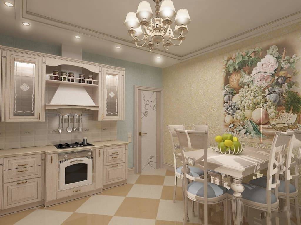 Современную кухню легко украсить фотообоями на весь периметр стены обеденной зоны. В стилях лофт, хай-тек и прованс будет хорошо смотреться урбанистические варианты. Для кантри или деревенского дизайна стены оформляются пейзажами, лесами и сочной зеленью гастрономической тематики. В любой современный стиль впишутся фотообои, главное подобрать правильный, так сказать, «повседневный» рисунок. Покрасить стены можно одним цветом, либо скомбинировать несколько цветов. Полосы, геометрия либо абстракция — все зависит от стиля кухни. Если стена покрашена в один тон ее легко дополнить элементами декора.