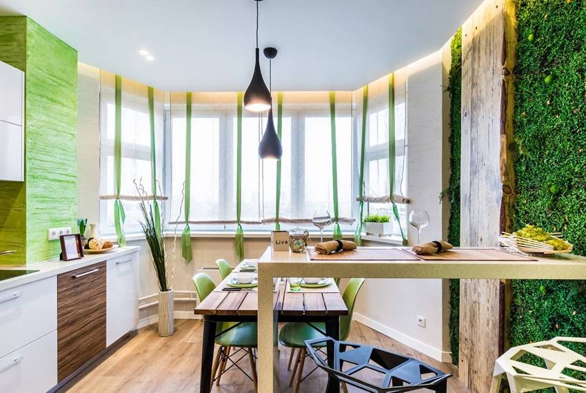 Если в кухне преобладают зеленые цвета — для обеденной зоны подойдут более светлые тона. Зеленый цвет возбуждает аппетит.