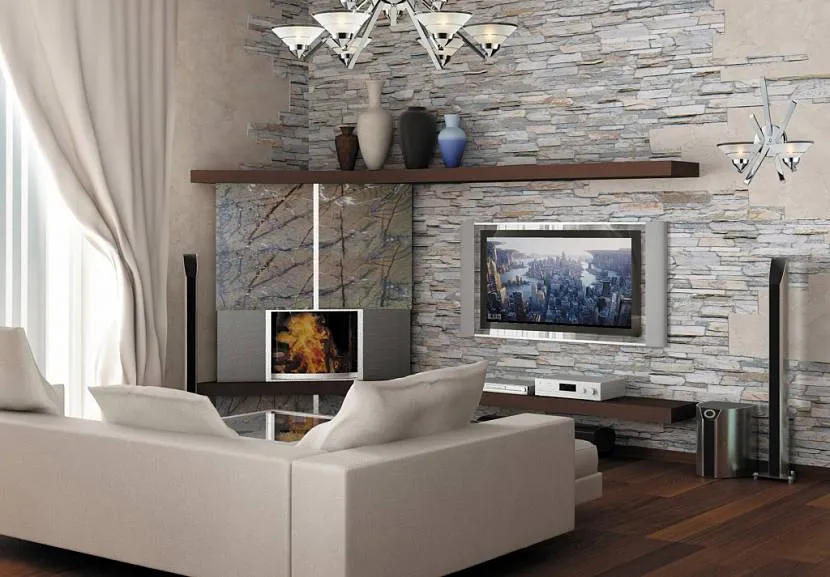 На сегодняшний день существует несколько подходов, как можно применить искусственный камень в интерьере гостиной. От используемого способа будет зависеть эффект, стилевое направление и внешний вид.