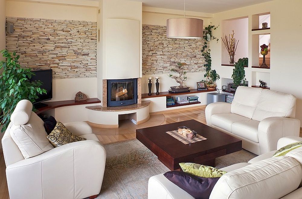 Перед тем, как украсить гостиную уникальным видом отделки, необходимо в первую очередь подобрать камень. Для зала можно использовать как натуральный материал, так и искусственный. При этом природный камень характеризуется хорошей прочностью, долговечностью, но стоит он очень дорого, поэтому его приобретение доступно не всем.