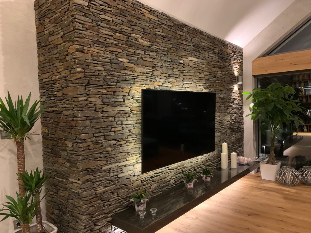 Применение искусственного камня при отделке стен зала для отдыха обеспечивает создание спокойной обстановки в доме.