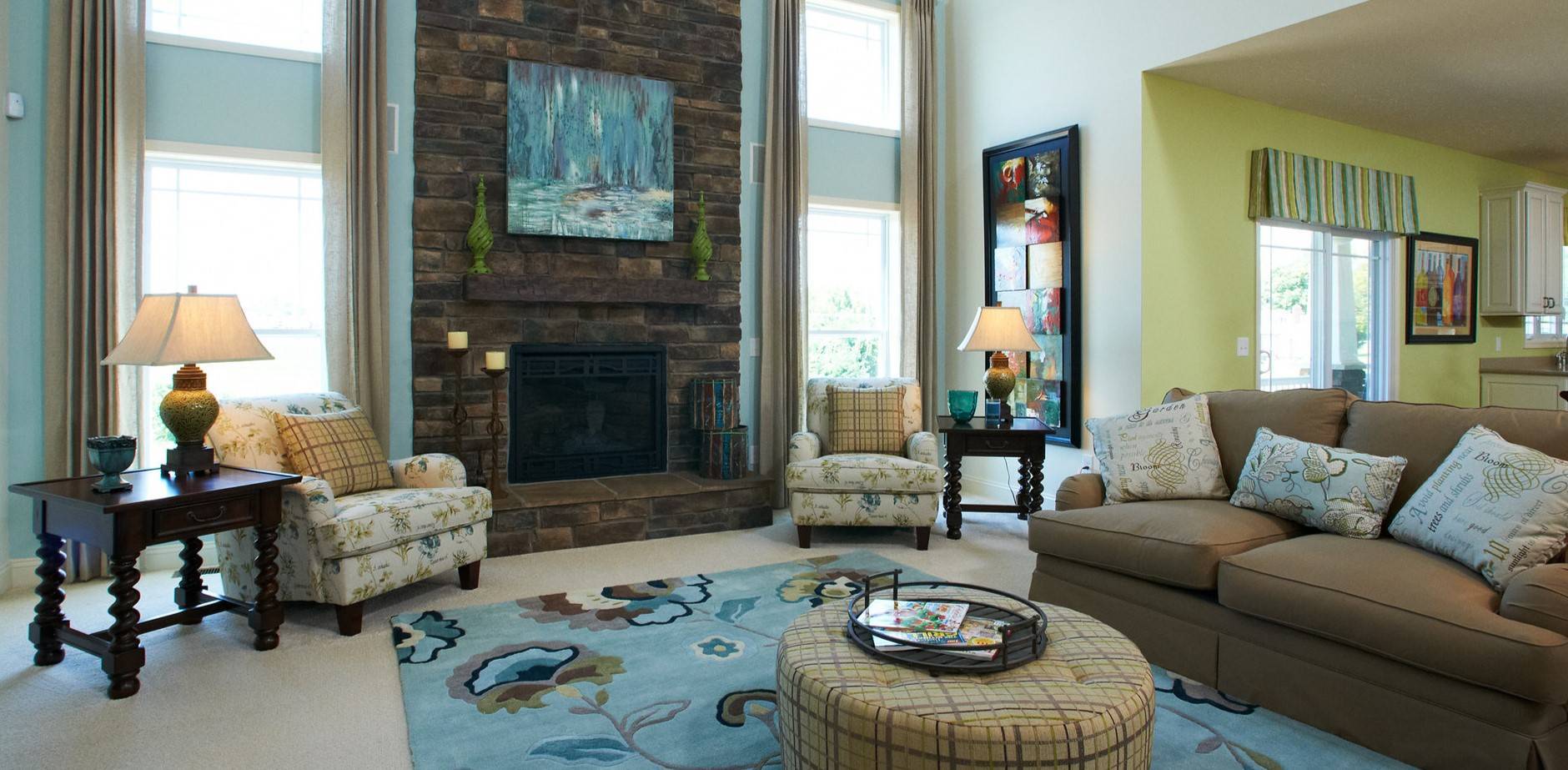 Применение искусственного камня при отделке стен зала для отдыха обеспечивает создание спокойной обстановки в доме.