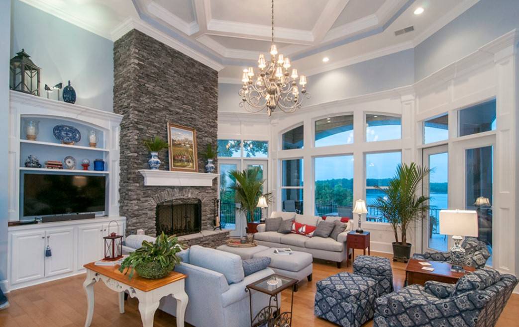В какой бы комнате не находился камин, по правилам оформления интерьера он должен занимать главное место и, соответственно, выделяться на основном фоне. Поэтому дизайнеры советуют облицовывать его декоративным камнем, чтобы скрыть грубую кирпичную кладку (если это не вписывается в стиль помещения) и придать необходимый цвет зоне. Ниже показано, как сморится камин из камня в интерьере гостиной на фото.