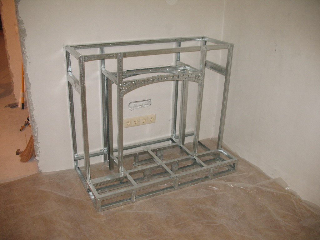 Каркас камина выполняют из оцинкованного профиля, скрепляя его саморезами. Ребра жесткости должны находиться во всех углах и на стыках листов ГКЛ, кроме того, если вы планируете установить на каминную полку тяжелые предметы, сделайте дополнительные подкосы и вертикальные стойки.