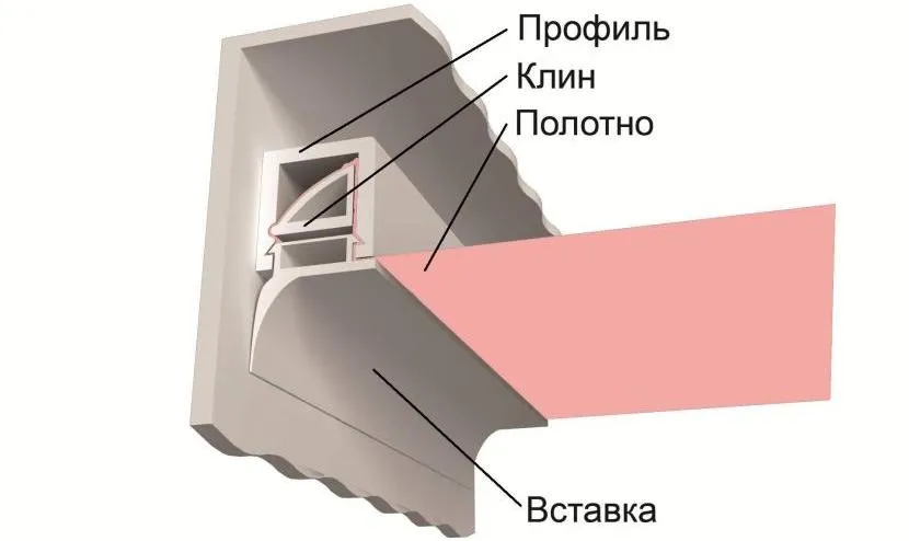 Во-вторых, диаметр декоративного шнура должен быть подобран из такого условия, чтобы в любых местах примыкания натяжного потолка к поверхности стен обеспечивалось полное перекрытие монтажного профиля.