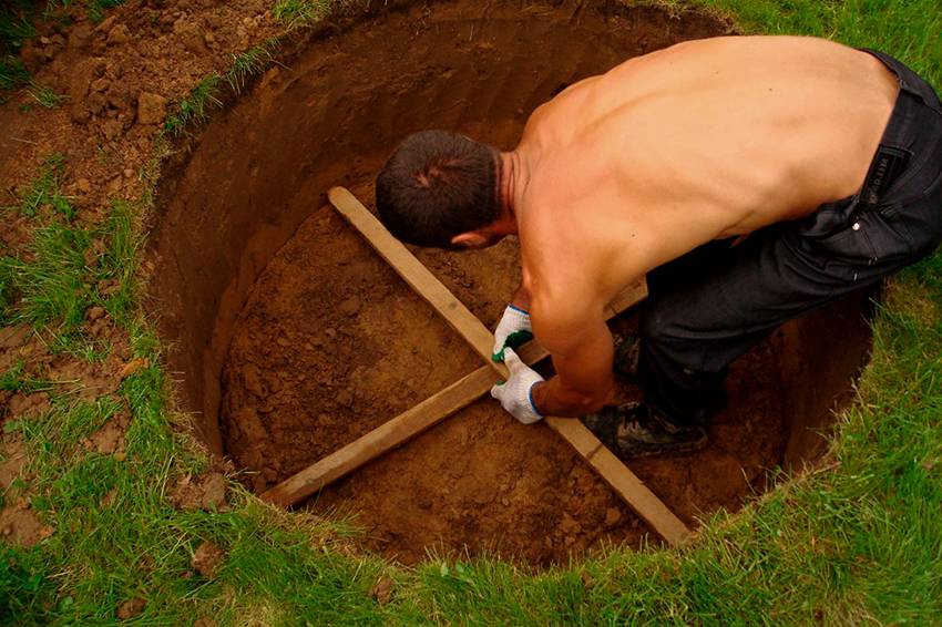 Шахту всегда копают лопатой с короткой рукояткой вручную, с таким инструментом намного легче будет управляться в ограниченном пространстве. Когда яма соответствующего диаметра будет глубиной около полуметра, проверяют ровность дна и устанавливают первое кольцо