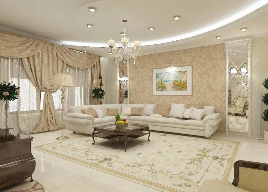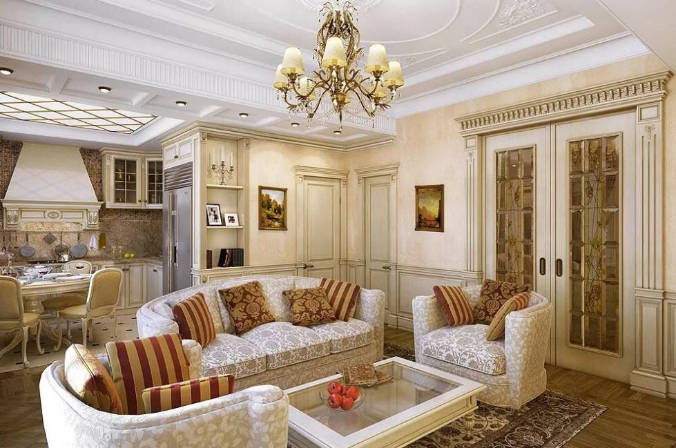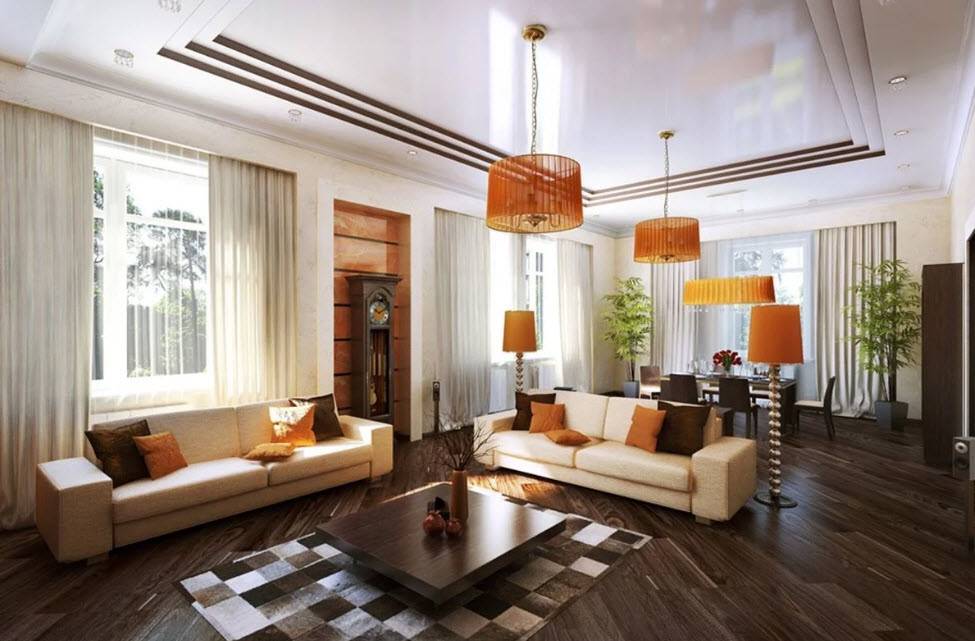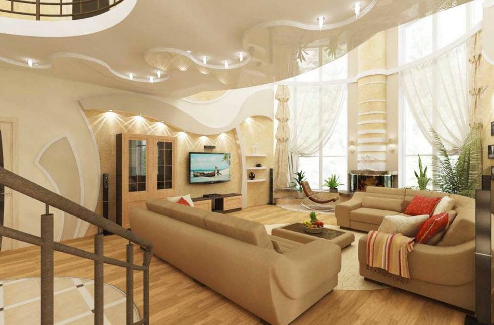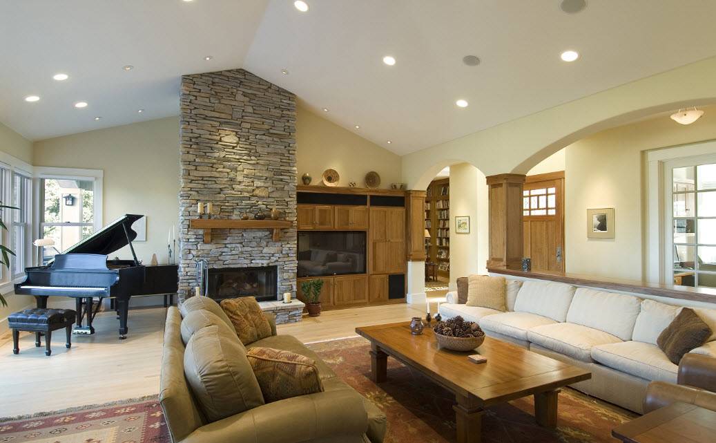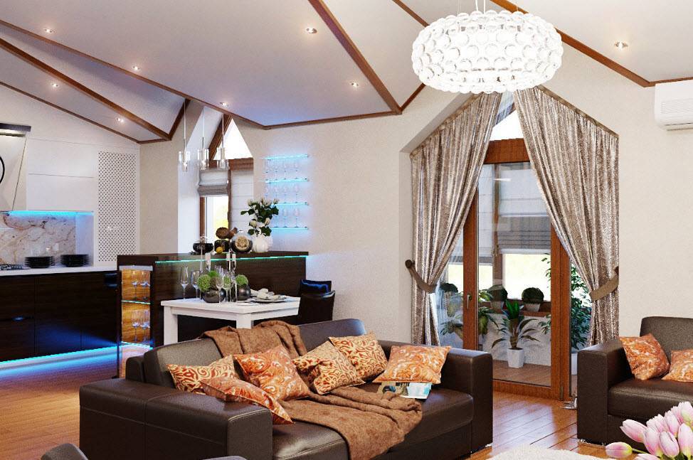 Гостиная – минимальная площадь составляет 12 квадратных метров. Помещение можно совместить с кухней, но в этом случае его площадь должна быть в три раза больше, чем площадь кухни. При правильной планировке прихожая ведет к гостиной, служащей центральной комнатой загородного дома.