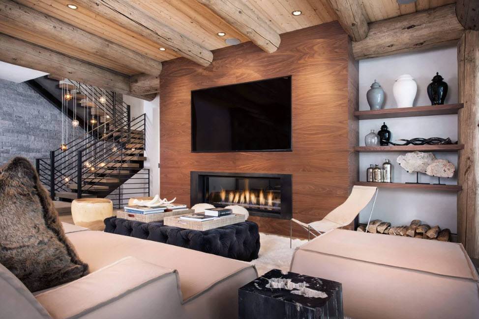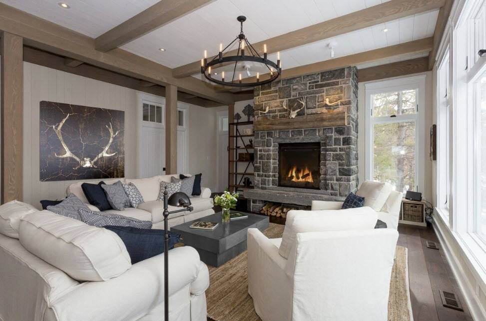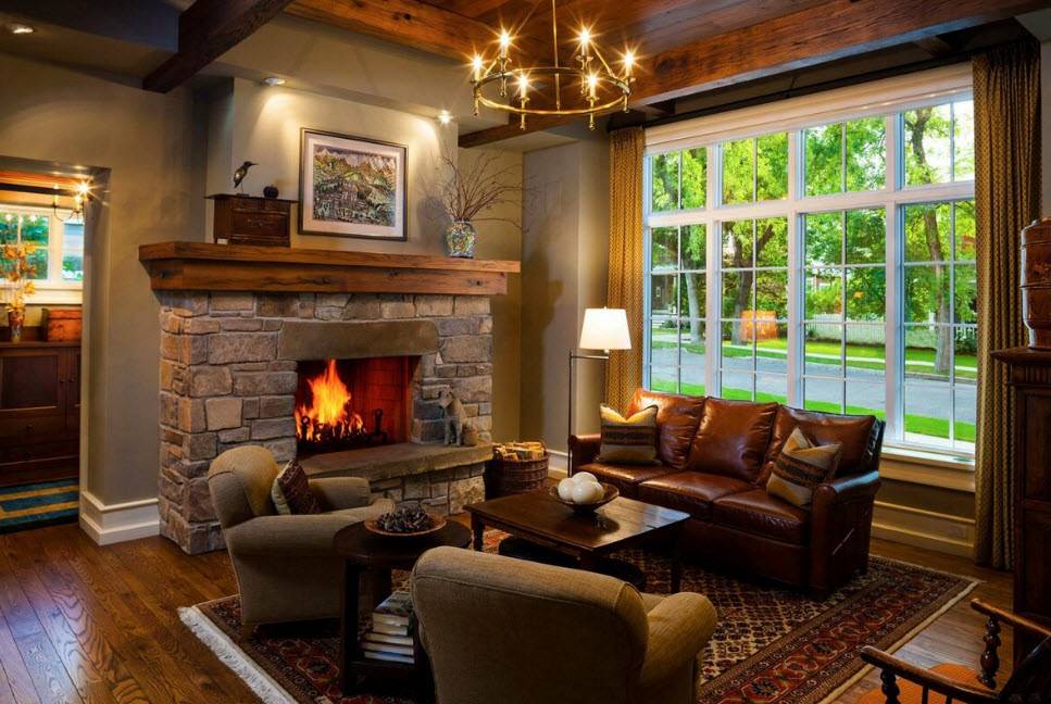 Практически традиционным элементом бревенчатого дома, считается камин. Для его облицовки выбирают такие материалы, как керамика, фарфор, камень, кирпич или металл. Иногда применяют специальную деревянную отделку, превращающую очаг в главный арт-объект комнаты.