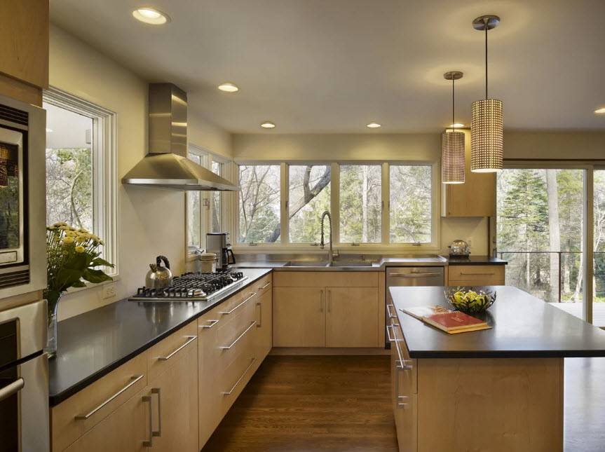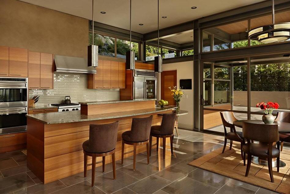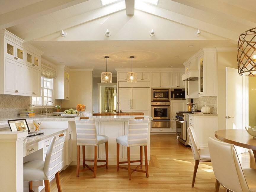 Кухня – ширина помещения должна составлять не менее 1,7 метра, площадь – 6 и более квадратных метров. Если здесь планируется прием пищи, то площадь комнаты должна составлять не менее 10 квадратных метров, альтернативное решение – совмещение кухни и гостиной, где вместо стен будут использоваться раздвижные перегородки или барная стойка. Расположить комнату нужно поближе к санузлу, обеспечив ее системой вентиляции.