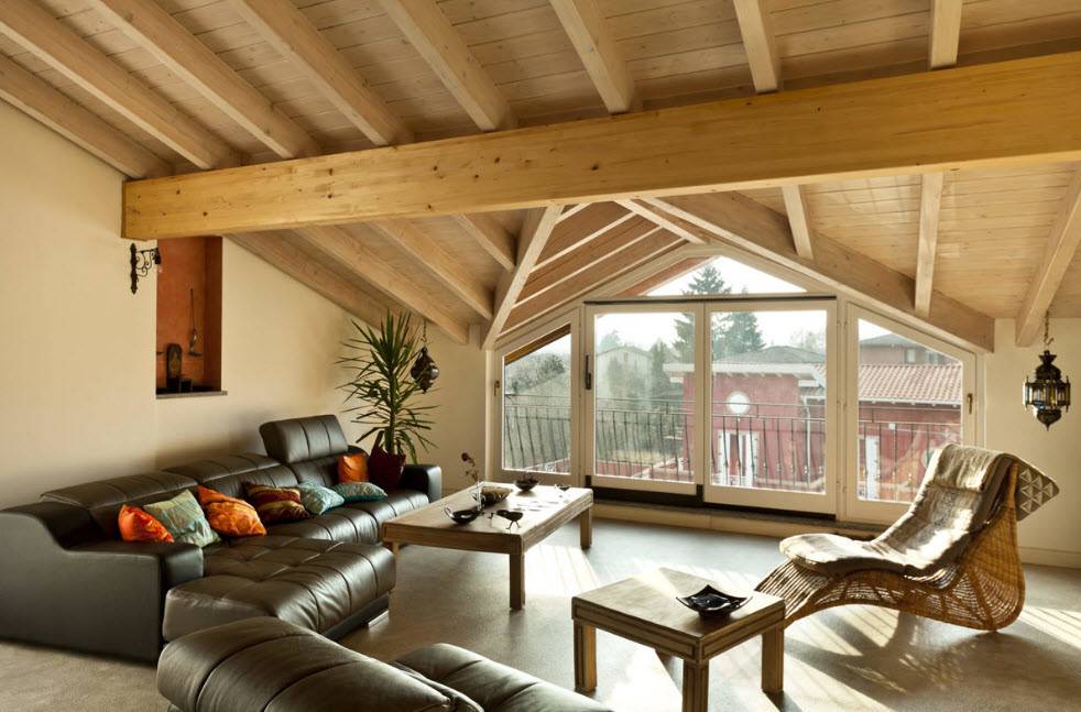 - Дом с мансардой, построенный из дерева, хорошо сочетается по стилю с мебелью и другими элементами интерьера из этого же материала.