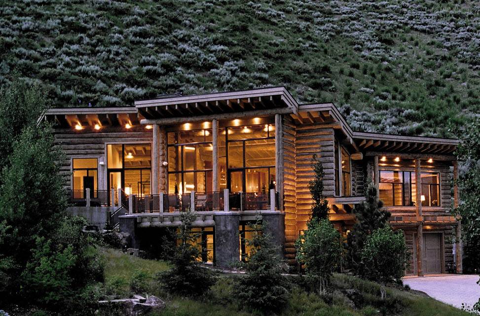 На фото гостиная в доме из бревна, оформленная панорамными коричневыми окнами.
