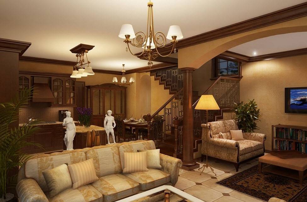На фото интерьер дома с камином, выполненный в классическом стиле.