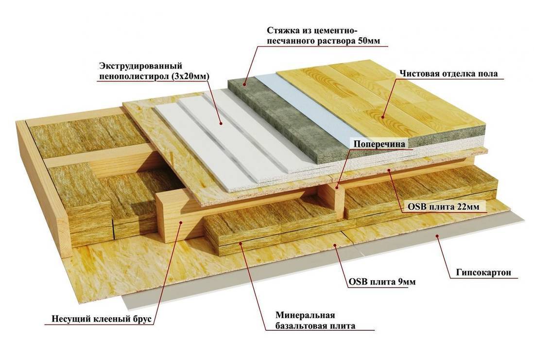 Конструкция многослойного пола для деревянного дома включает разные элементы, несущие определенную функциональную нагрузку. Это: